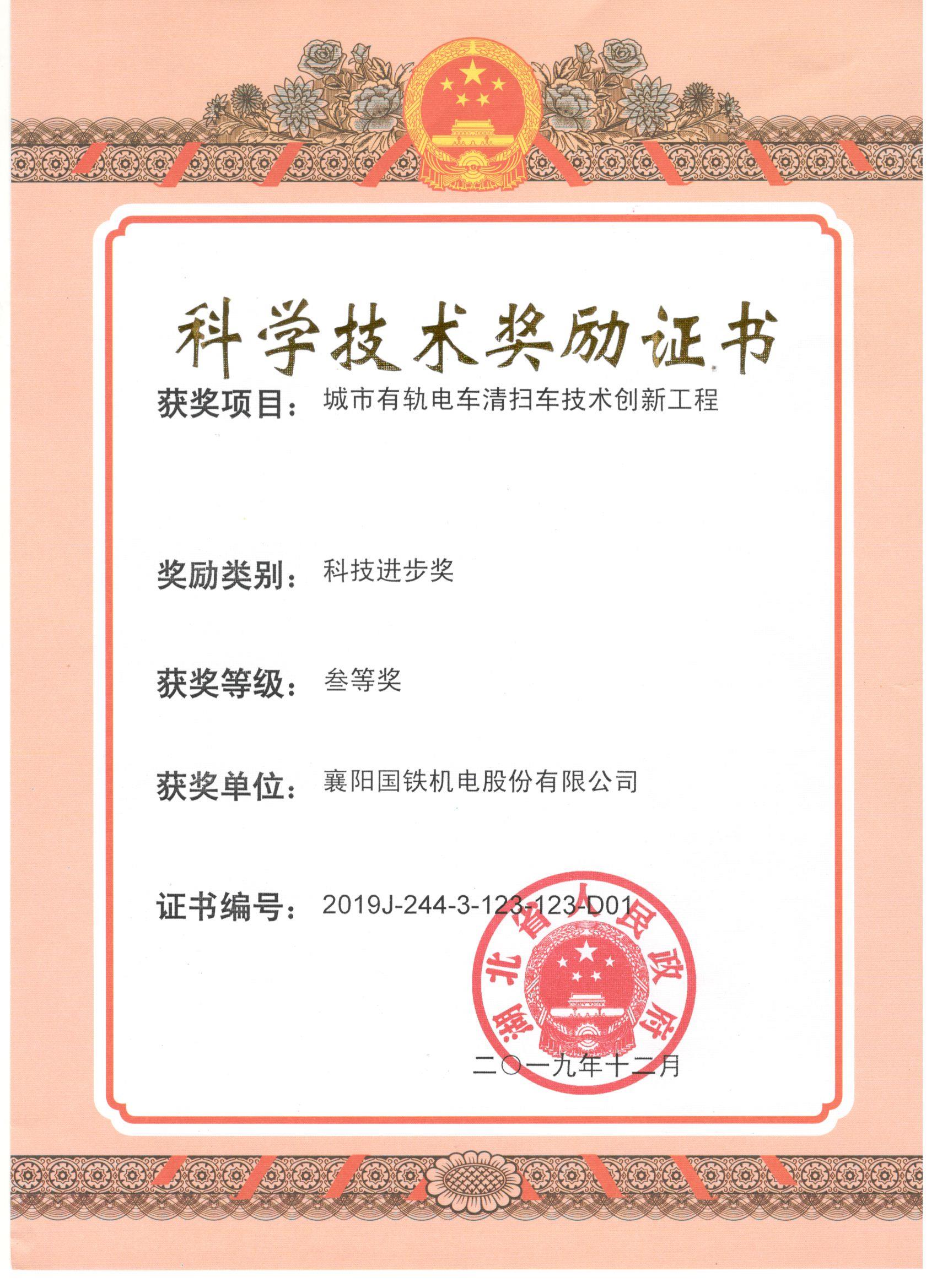 湖北省科技進步三等獎 城市有軌電車清掃車